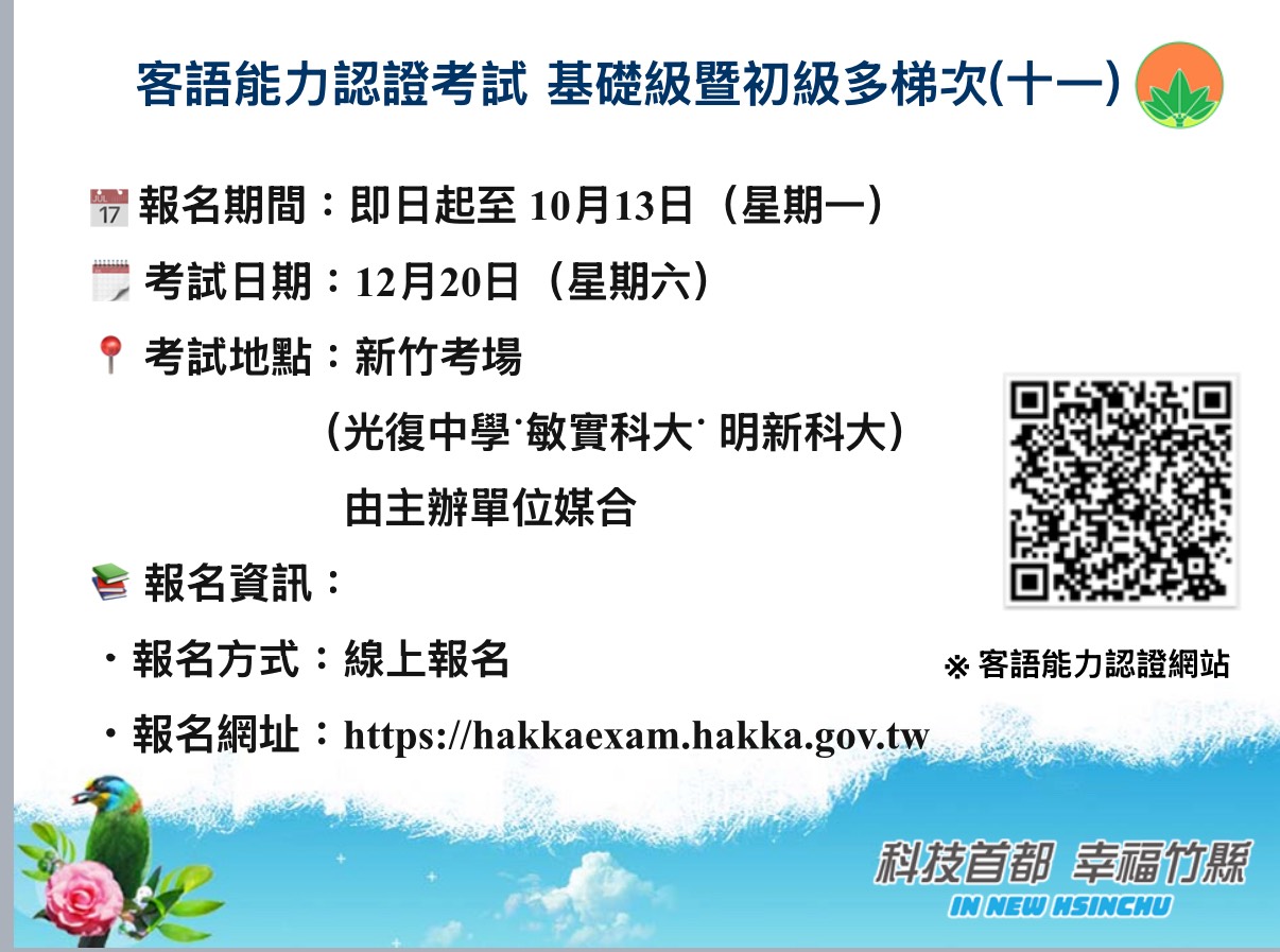 新竹縣為鼓勵學生取得客語認證,特別增加新竹縣認證場次,歡迎各位家長鼓勵孩子報名參加。